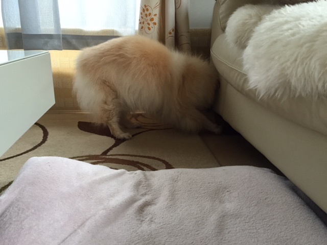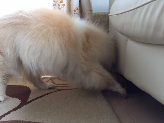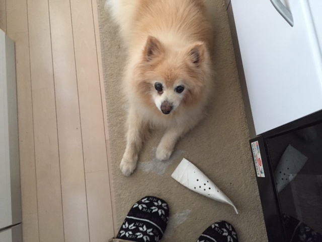オジチャンがとってあげて、キッチンペーパーで作ったオモチャとの挌闘再開となったのですが・・・。