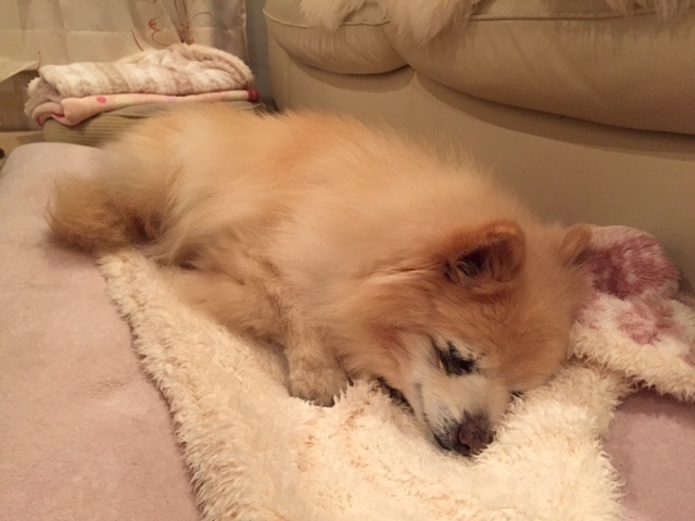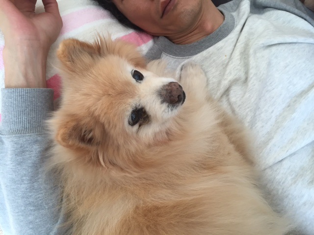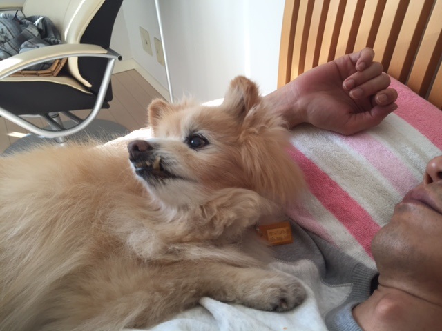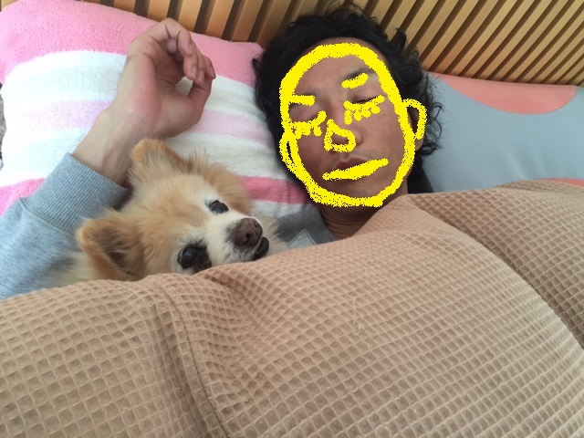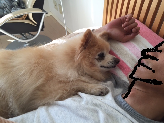 モクちゃんと一緒にオジチャンを起こしにいって、モクちゃんをベッドの中にもぐりこませたら・・・あらま、モクちゃん自然にベッドになじんでました~