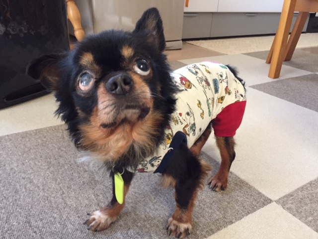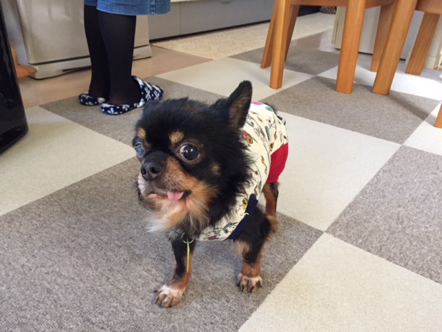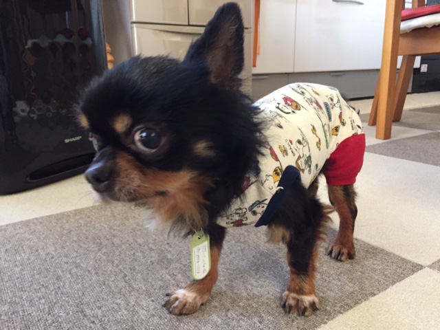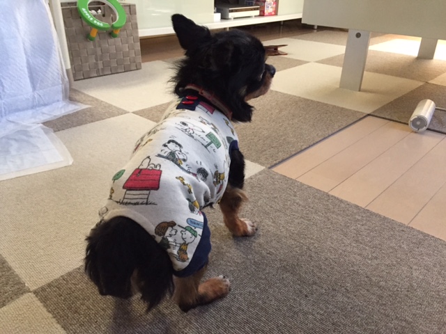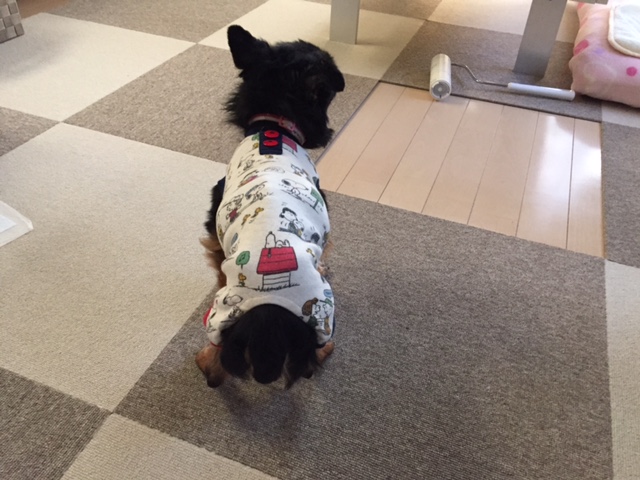 つなぎのお洋服に戸惑って固まってます(^m^)