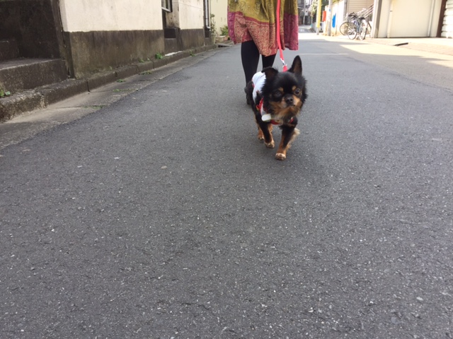まだ、リードになれていないので、引っ張られる感じがすると止まって固まってしまうので、ゆるーくたるませて、チャイたんの歩みにあわせます。