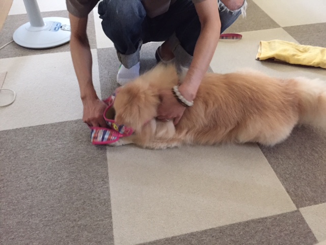 ひとしきり喜びのクルクルをしてハーネスに自ら頭をつっこんでくるのですが、興奮してくねくねするから、つけにくいの(^_^;