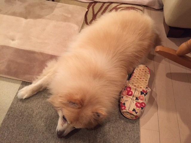おわびに ワカバチャンの スリッパ あたためてるです。