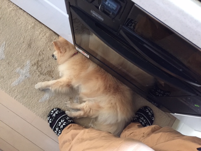 直球勝負。キッチンの下にいれば絶対くいっぱぐれないよね作戦のモクちゃん。