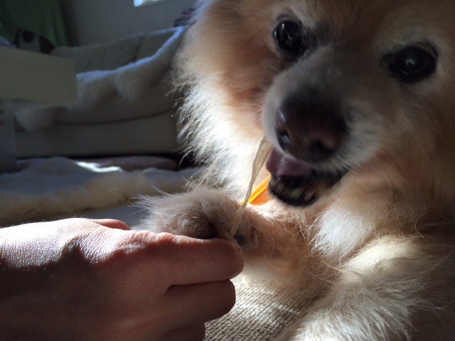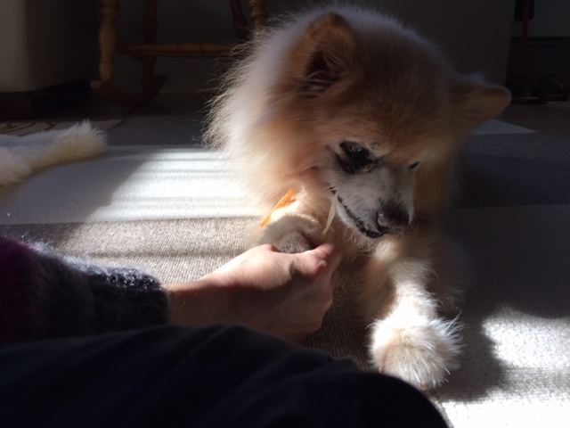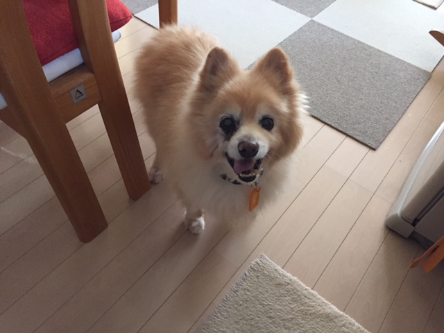 お散歩行くよーの時はクルクルまわってはしゃぐし、オヤツやゴハンも美味しく食べるし、人間ウォッチングをしてはくっついて回って、時にはトイレの前で待ち伏せしたりもして、眠くなったらごろ寝してと、毎日フツーに機嫌よく暮らしています。